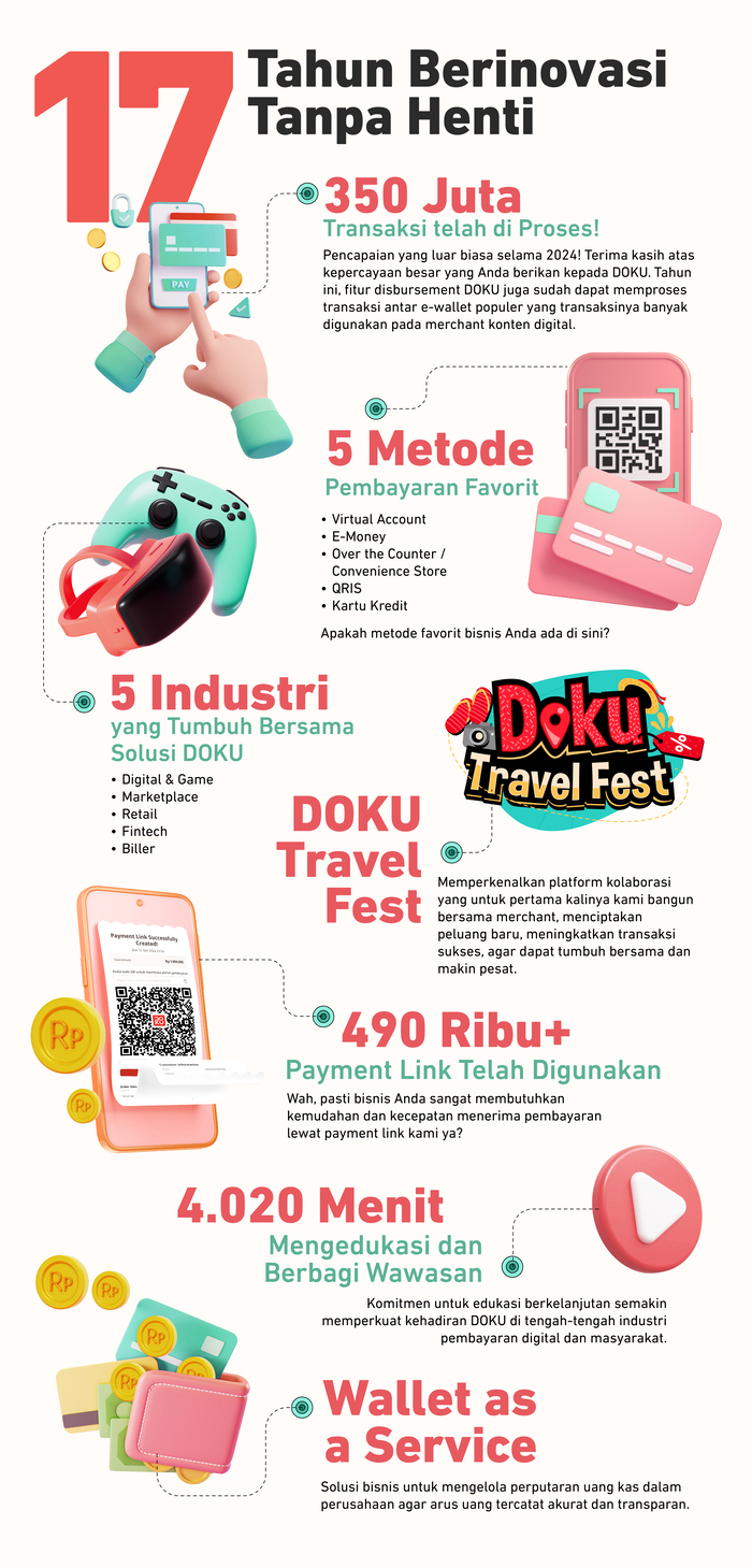 Selama 17 tahun, DOKU terus berinovasi, bergerak maju bersama para merchant dan stakeholder dan senantiasa memberikan kontribusi dalam memajukan industri fintech pembayaran di Indonesia.