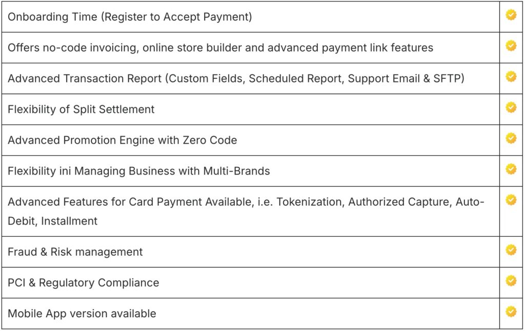 - Dengan fitur single API untuk semua solusi transaksi pembayaran termasuk credit card, online bank transfer, convenience store, direct debit, e-wallet dan instalment non-bank; yang diintegrasikan dengan mudah dan stabil.