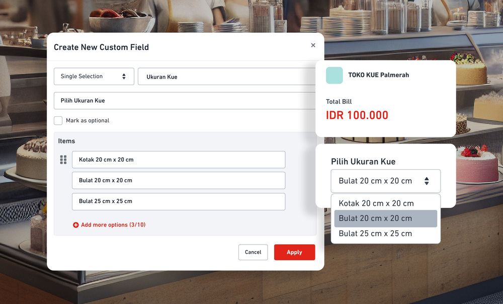 Dalam bisnis F&B, seperti toko custom cake, pelanggan sering meminta penyesuaian pesanan terkait ukuran, bentuk, dan pesan khusus. Untuk mengatasi tantangan ini sambil tetap menerima transaksi pembayaran, fitur Custom Field hadir sebagai solusi. Fitur ini memungkinkan bisnis menambahkan detail spesifik pada setiap pesanan. Setelah pelanggan mengkonfirmasi pembelian, Anda dapat segera membuat tautan pembayaran yang mencakup informasi pesanan melalui kolom custom field. Tautan ini dapat dikirim kepada pelanggan melalui chat atau email, memungkinkan mereka untuk melakukan pembayaran online sambil menambahkan catatan khusus, seperti ucapan ulang tahun. Dengan demikian, Anda dapat menerima pembayaran secara cepat dan akurat sesuai preferensi pelanggan.